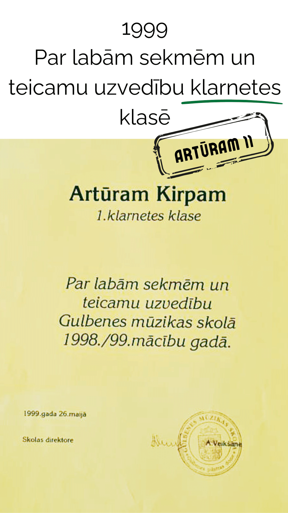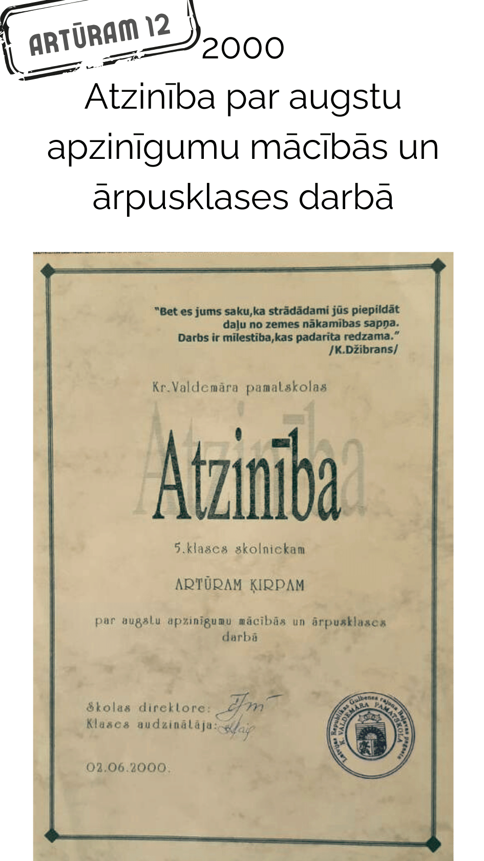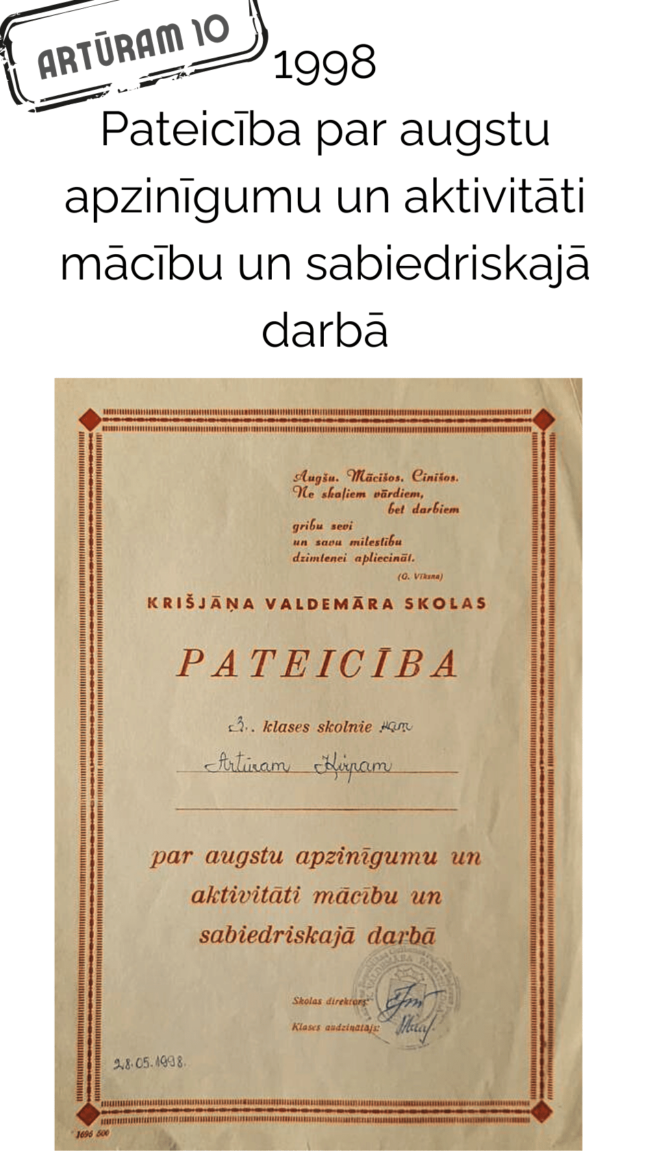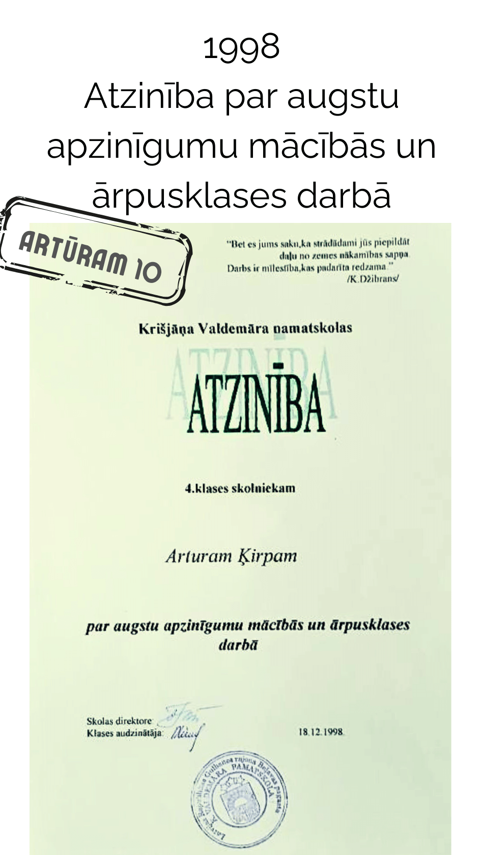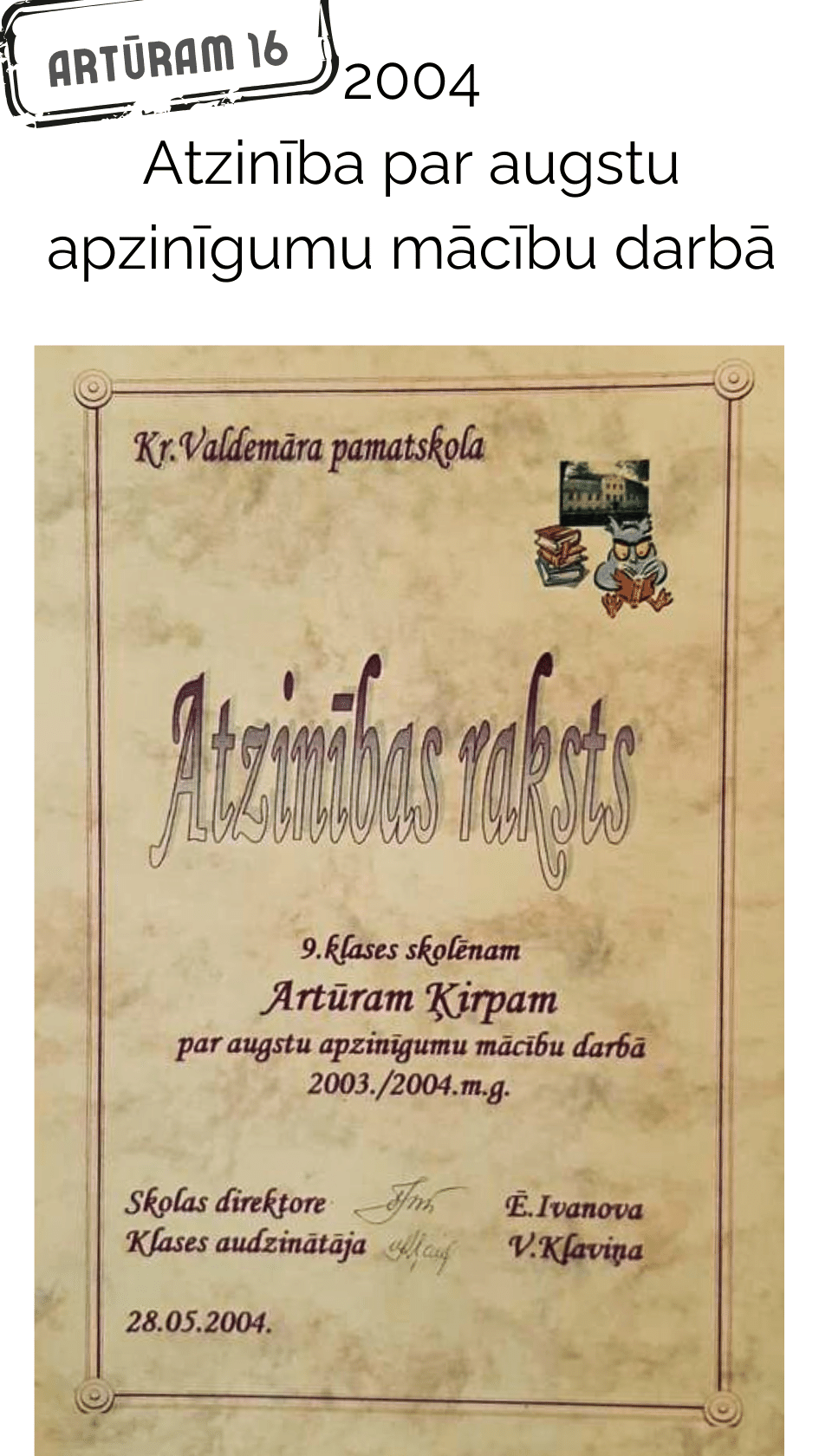 Artūra Ķirpa vecāku rūpīgi glabātie dēla diplomi liecina, ka pirmo diplomu Artūrs saņēmis septiņu gadu vecumā, izgudrojot kādas konfektes nosaukumu. Kopumā vecāku izveidotajā arhīvā ir 90 diplomi, atzinības raksti, sertifikāti, apliecinājumi, apbalvojumi un citas godalgas, kas gluži kā starmeši izgaismo Artūra dzīves pagriezienus, nebeidzamo radītkāri un urdošo vēlmi paplašināties. Nu Artūra diplomu arhīvs ieguvis digitālu veidolu. Šķita negodīgi šīs pērles turēt bēniņos.