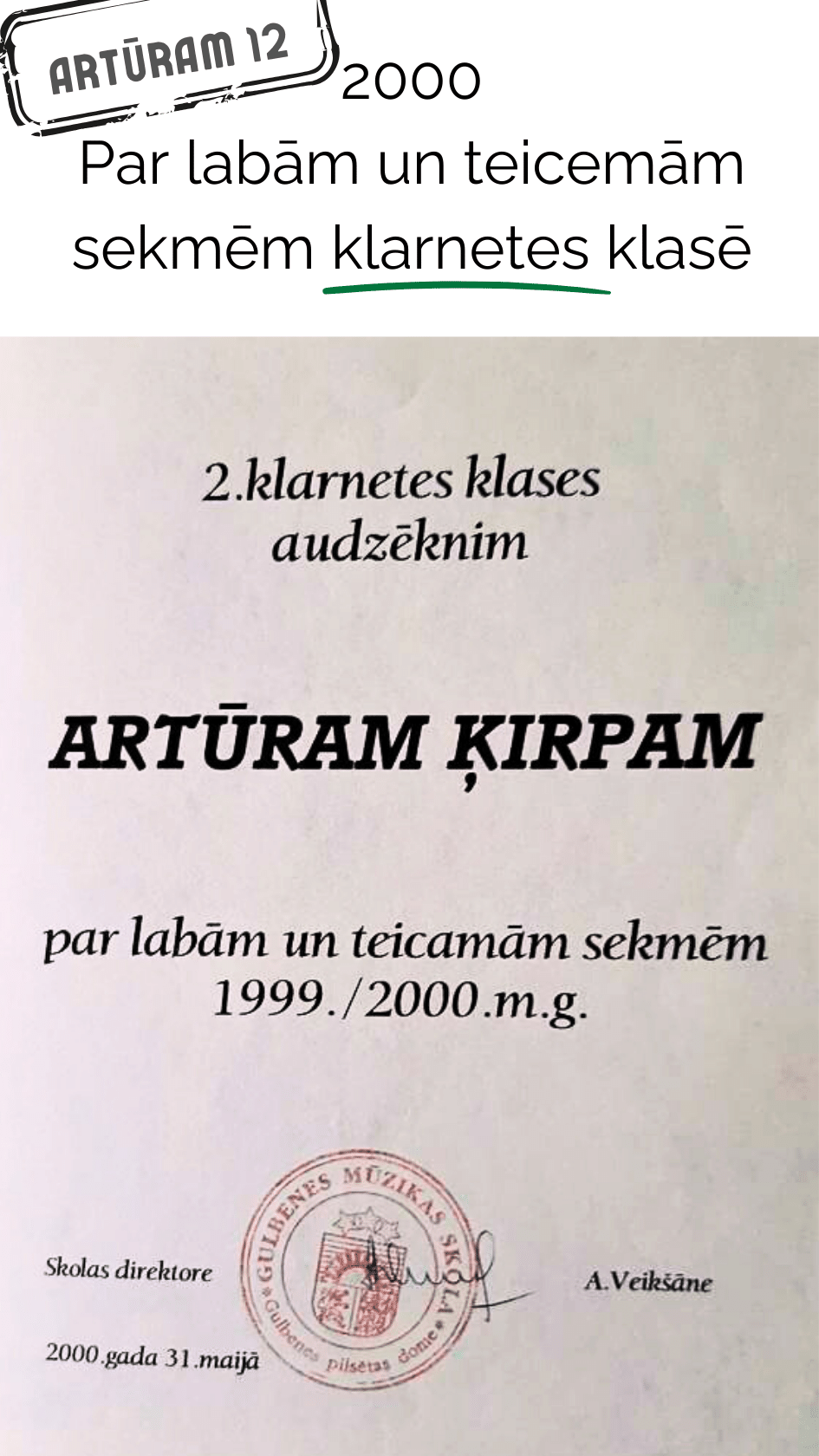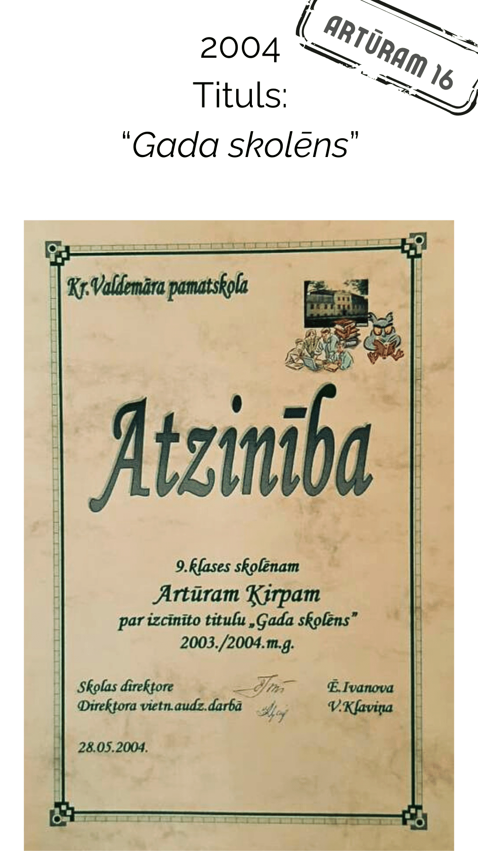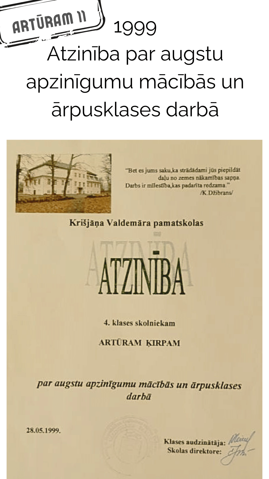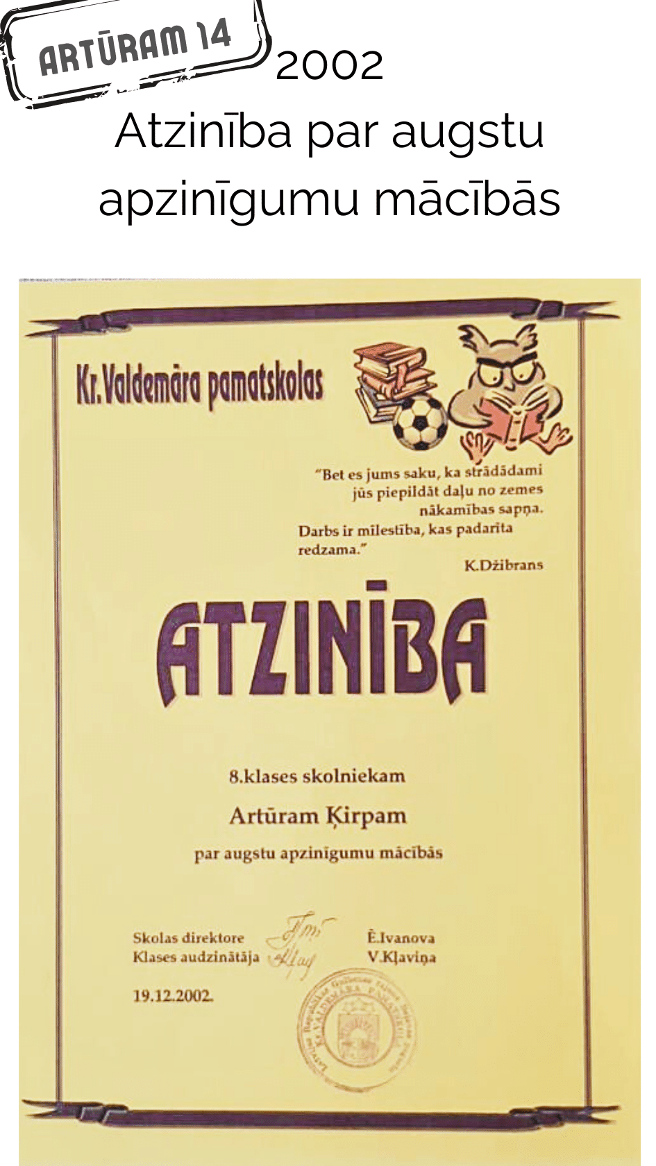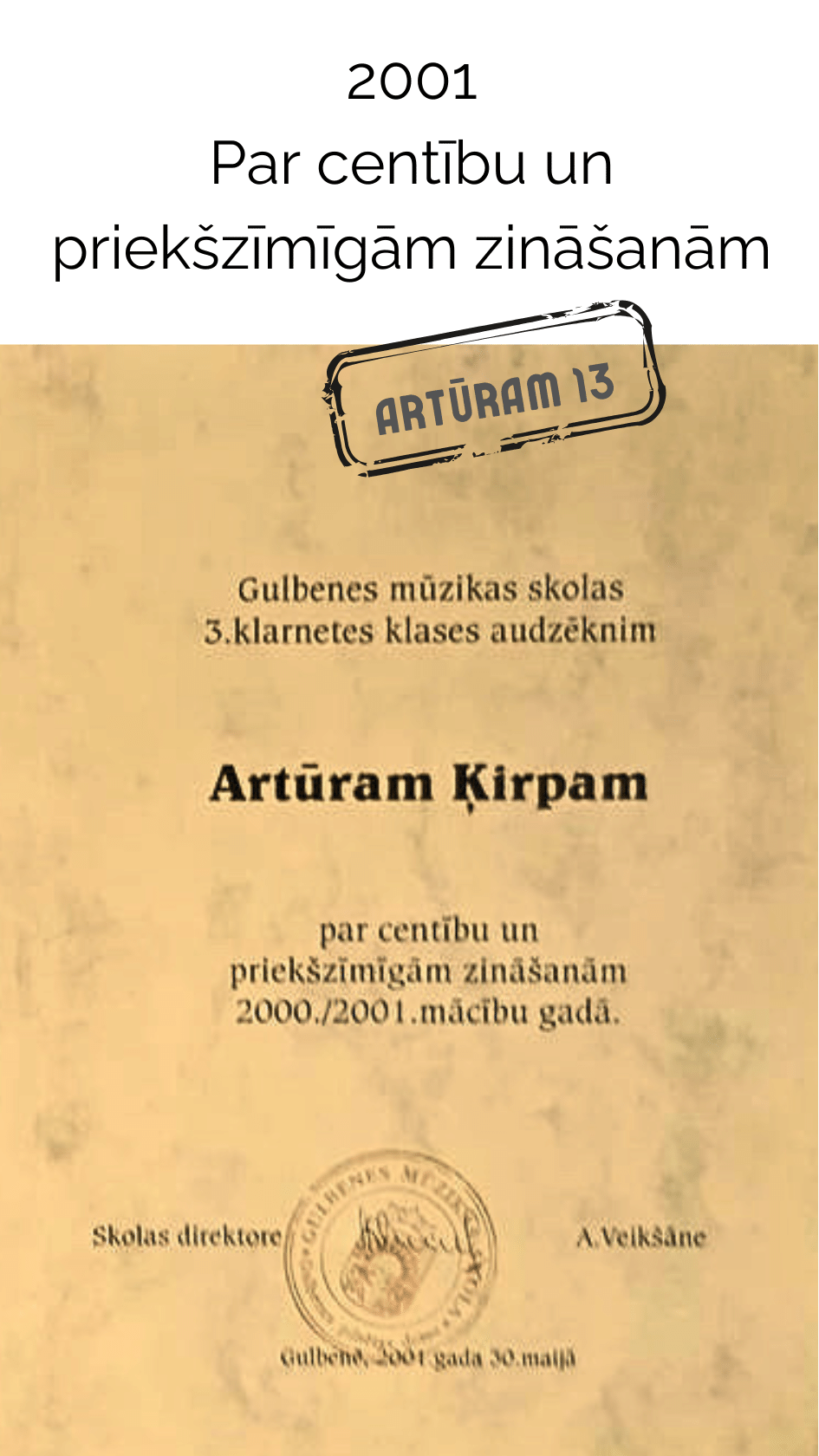 Artūra Ķirpa vecāku rūpīgi glabātie dēla diplomi liecina, ka pirmo diplomu Artūrs saņēmis septiņu gadu vecumā, izgudrojot kādas konfektes nosaukumu. Kopumā vecāku izveidotajā arhīvā ir 90 diplomi, atzinības raksti, sertifikāti, apliecinājumi, apbalvojumi un citas godalgas, kas gluži kā starmeši izgaismo Artūra dzīves pagriezienus, nebeidzamo radītkāri un urdošo vēlmi paplašināties. Nu Artūra diplomu arhīvs ieguvis digitālu veidolu. Šķita negodīgi šīs pērles turēt bēniņos.