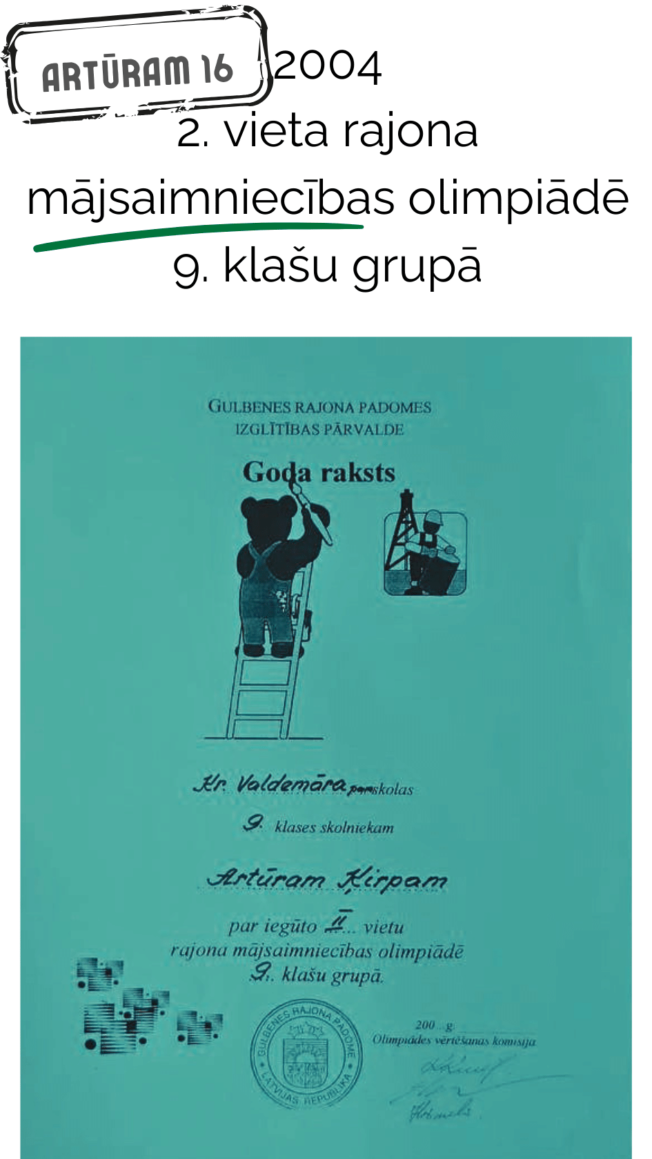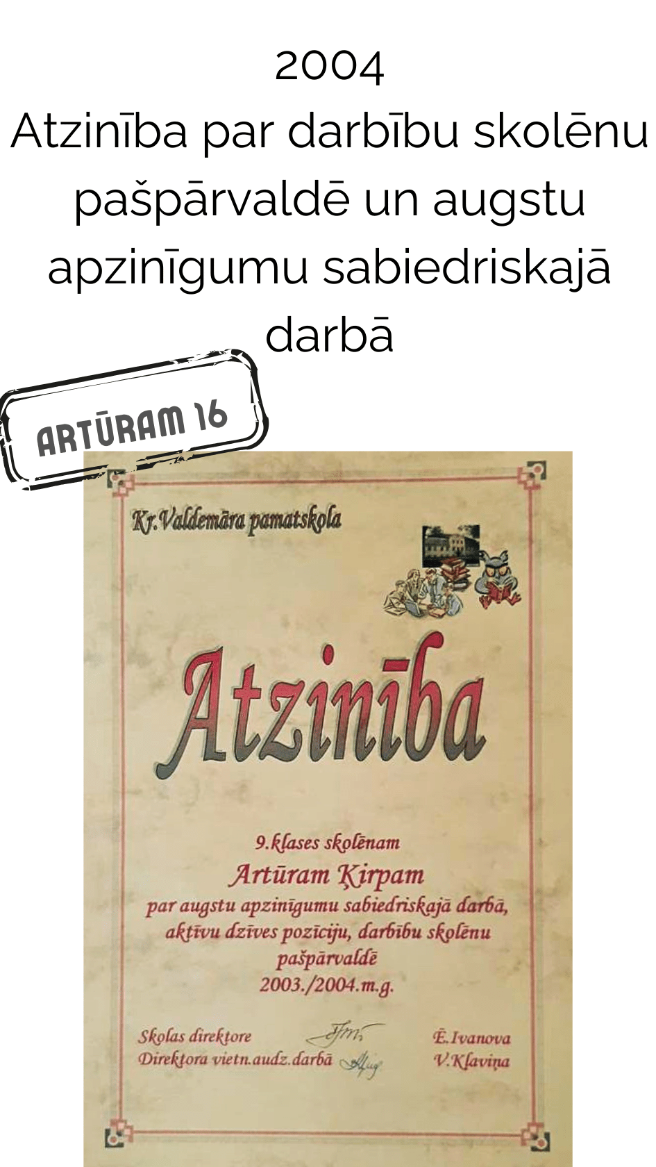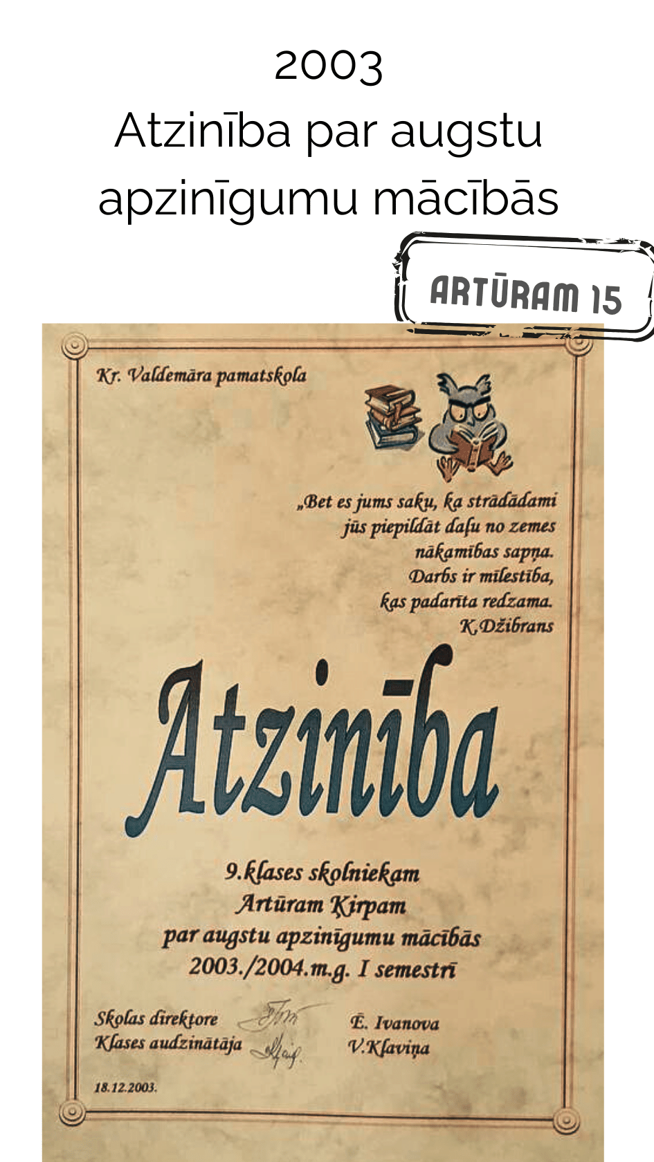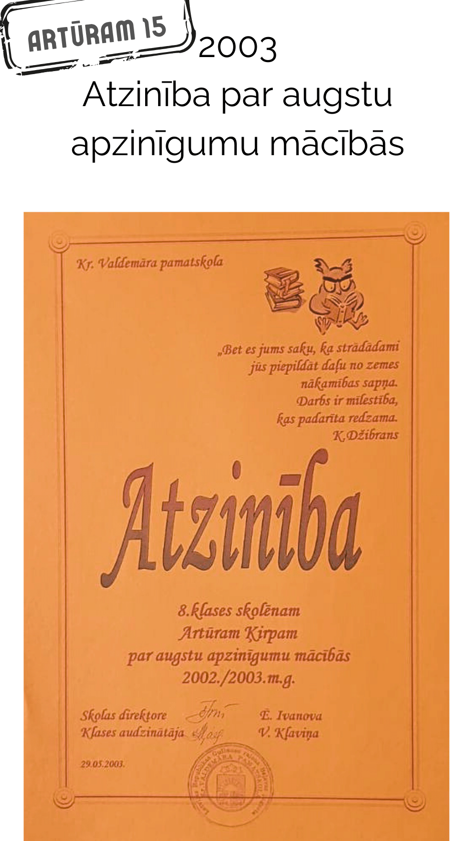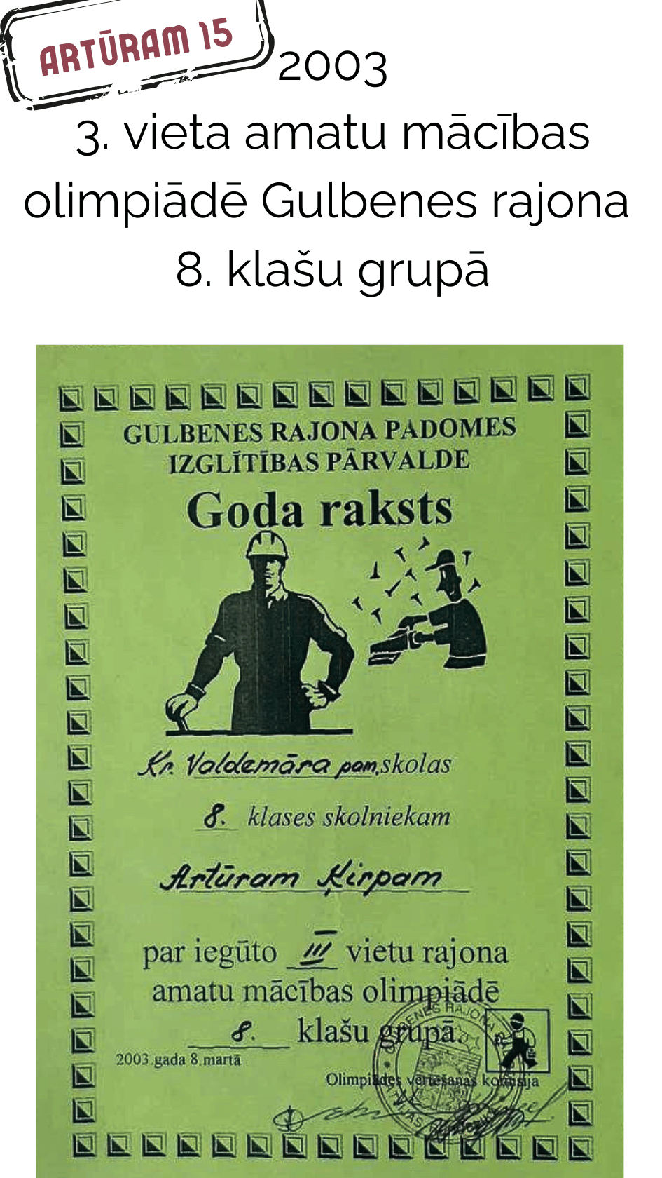 Artūra Ķirpa vecāku rūpīgi glabātie dēla diplomi liecina, ka pirmo diplomu Artūrs saņēmis septiņu gadu vecumā, izgudrojot kādas konfektes nosaukumu. Kopumā vecāku izveidotajā arhīvā ir 90 diplomi, atzinības raksti, sertifikāti, apliecinājumi, apbalvojumi un citas godalgas, kas gluži kā starmeši izgaismo Artūra dzīves pagriezienus, nebeidzamo radītkāri un urdošo vēlmi paplašināties. Nu Artūra diplomu arhīvs ieguvis digitālu veidolu. Šķita negodīgi šīs pērles turēt bēniņos.