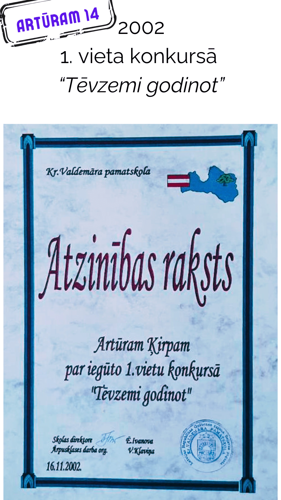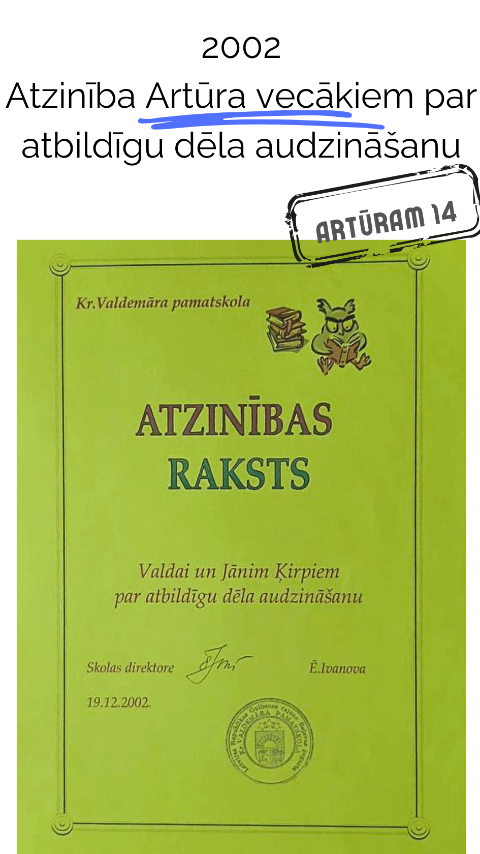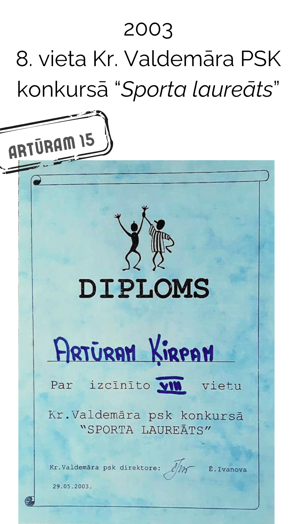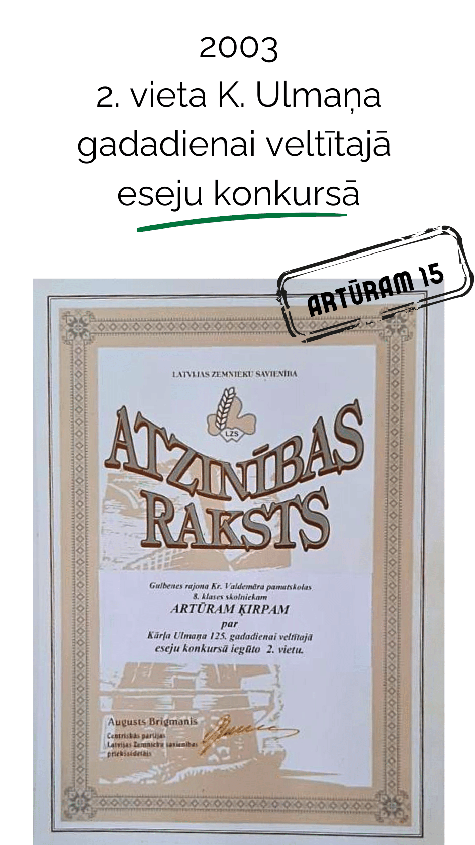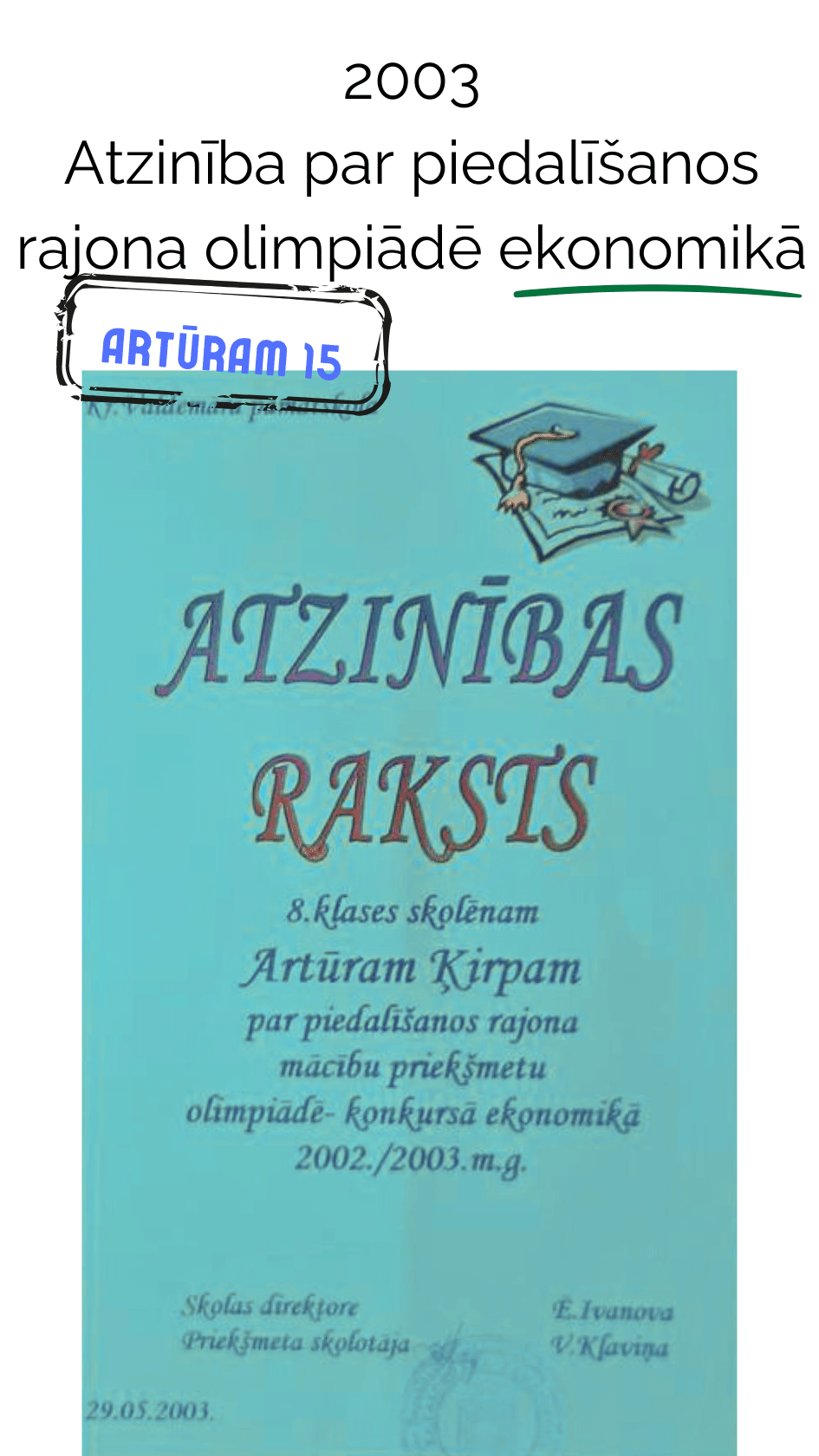 Artūra Ķirpa vecāku rūpīgi glabātie dēla diplomi liecina, ka pirmo diplomu Artūrs saņēmis septiņu gadu vecumā, izgudrojot kādas konfektes nosaukumu. Kopumā vecāku izveidotajā arhīvā ir 90 diplomi, atzinības raksti, sertifikāti, apliecinājumi, apbalvojumi un citas godalgas, kas gluži kā starmeši izgaismo Artūra dzīves pagriezienus, nebeidzamo radītkāri un urdošo vēlmi paplašināties. Nu Artūra diplomu arhīvs ieguvis digitālu veidolu. Šķita negodīgi šīs pērles turēt bēniņos.