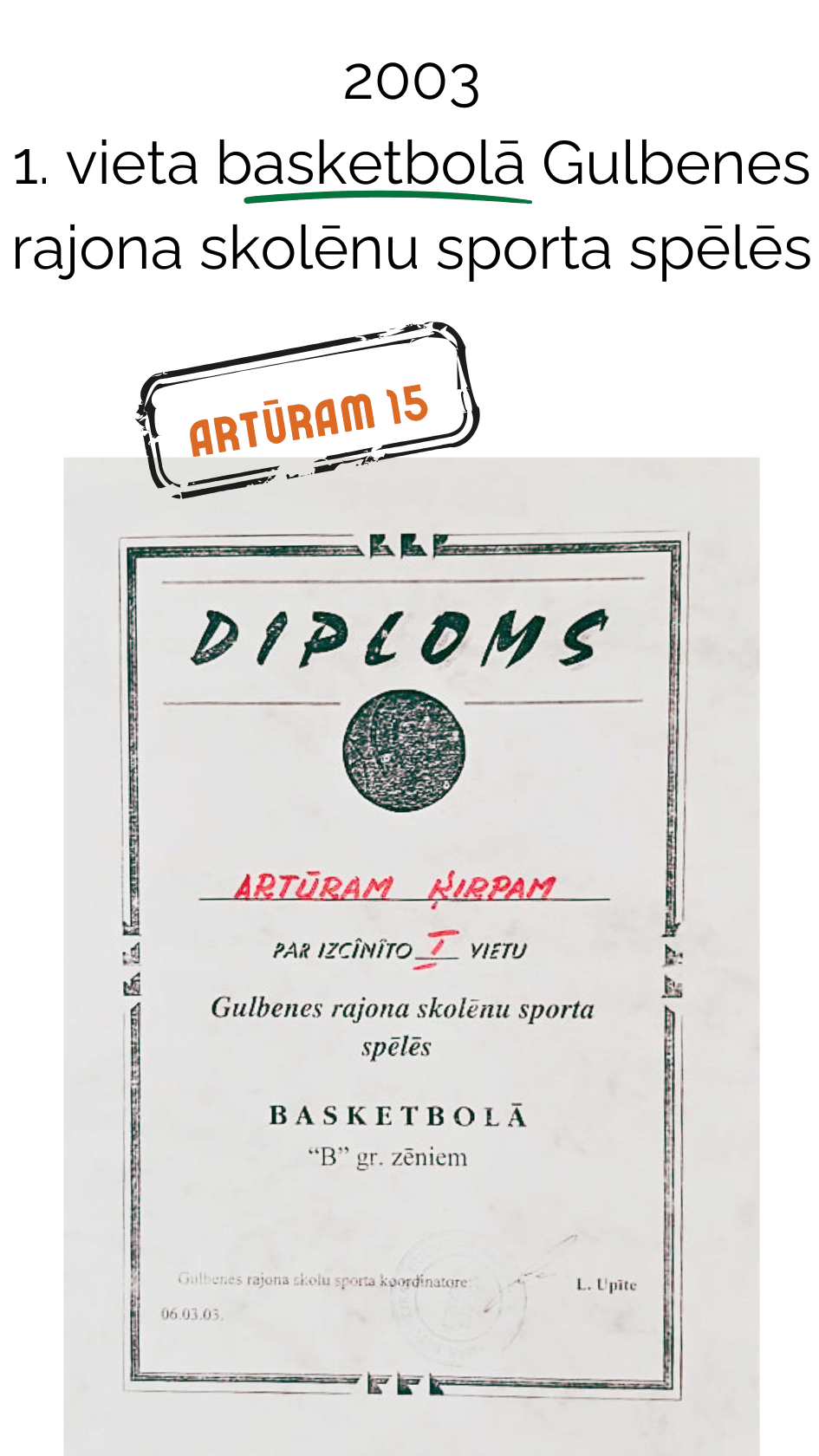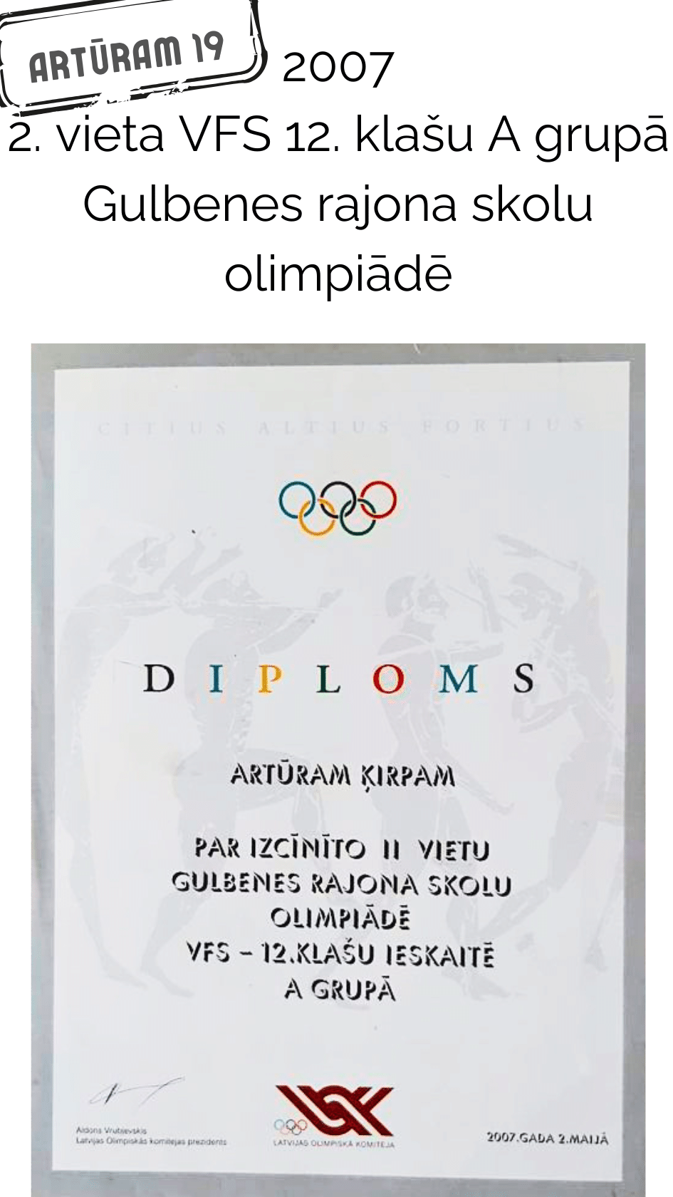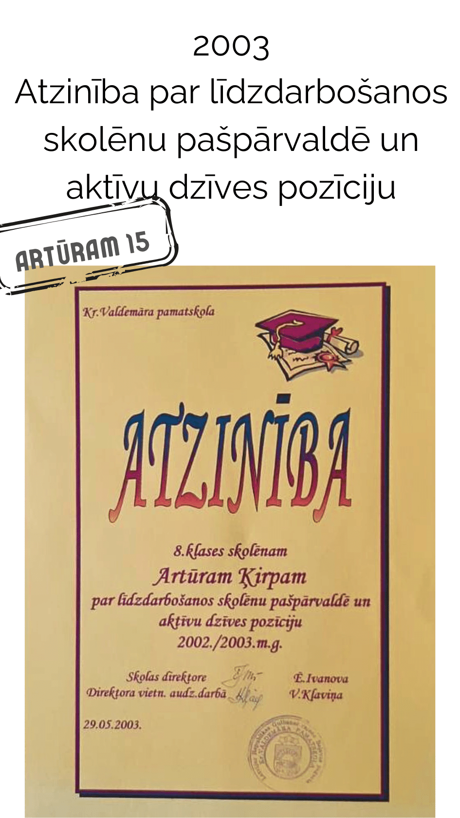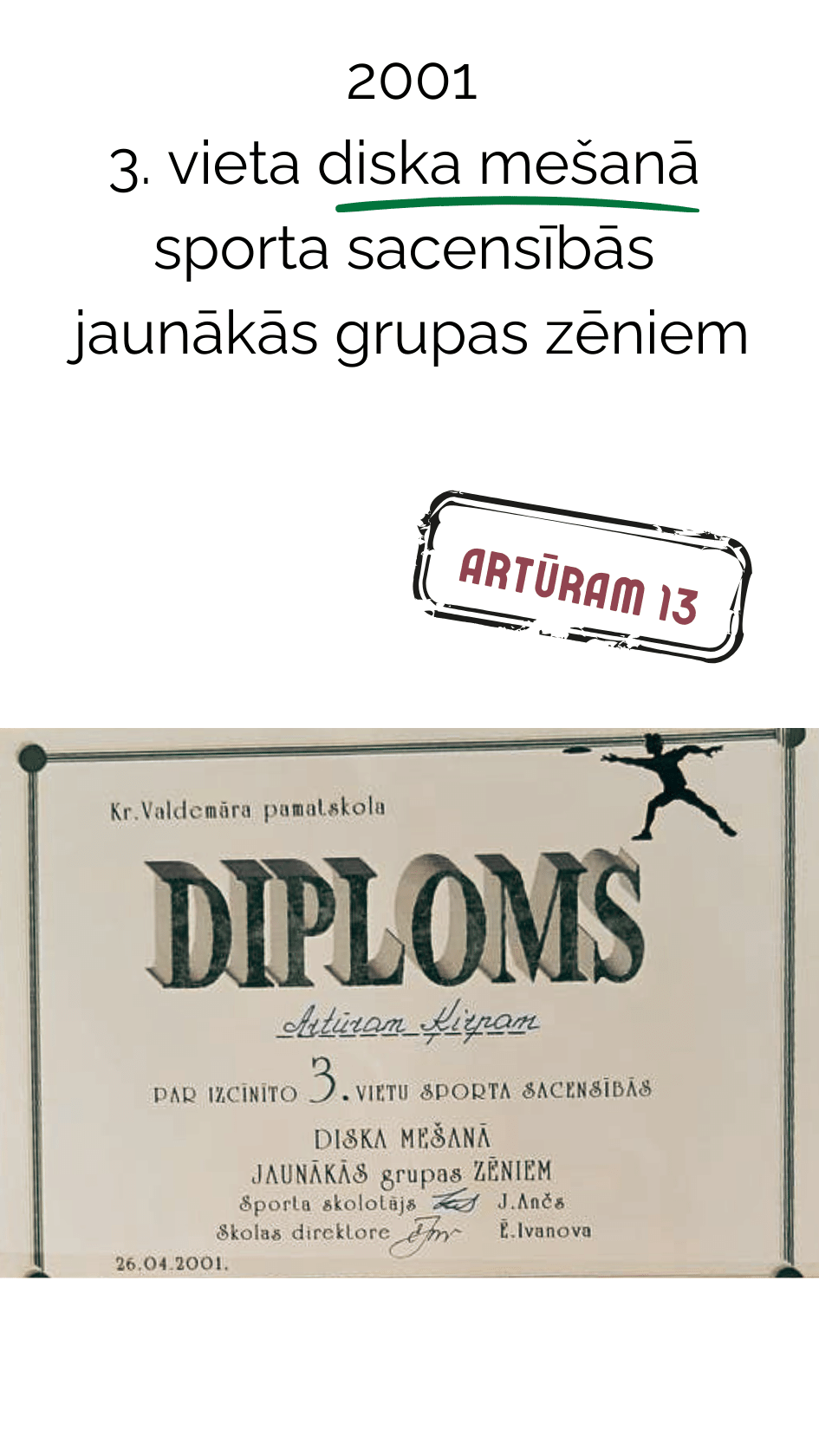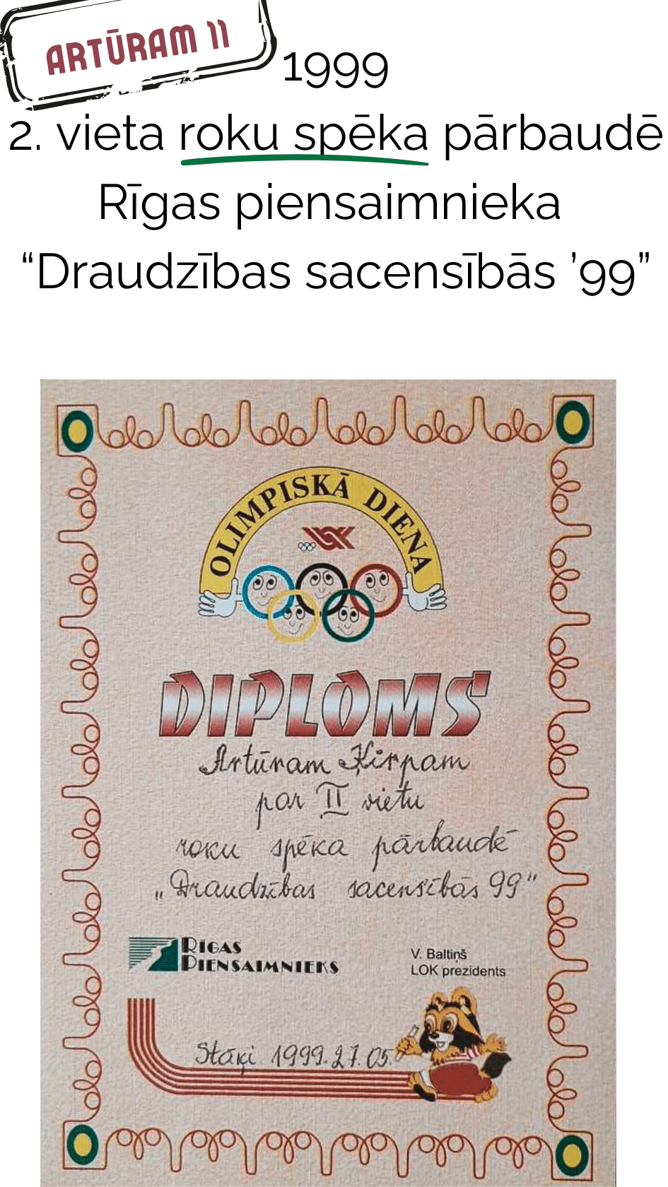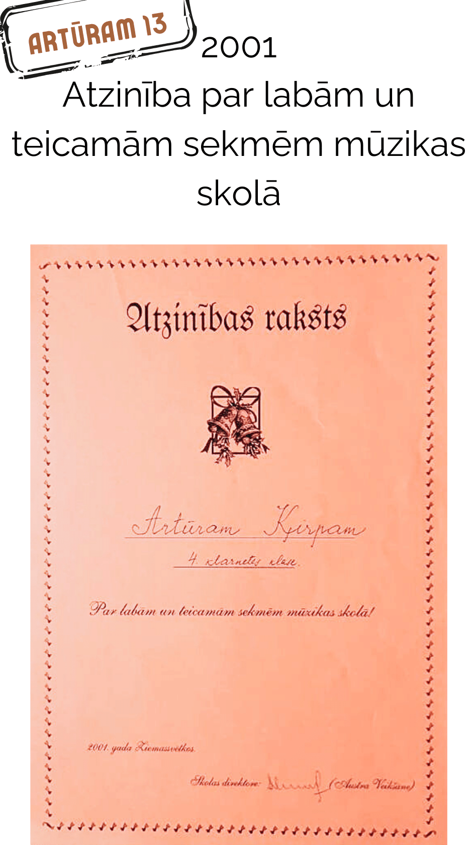 Artūra Ķirpa vecāku rūpīgi glabātie dēla diplomi liecina, ka pirmo diplomu Artūrs saņēmis septiņu gadu vecumā, izgudrojot kādas konfektes nosaukumu. Kopumā vecāku izveidotajā arhīvā ir 90 diplomi, atzinības raksti, sertifikāti, apliecinājumi, apbalvojumi un citas godalgas, kas gluži kā starmeši izgaismo Artūra dzīves pagriezienus, nebeidzamo radītkāri un urdošo vēlmi paplašināties. Nu Artūra diplomu arhīvs ieguvis digitālu veidolu. Šķita negodīgi šīs pērles turēt bēniņos.