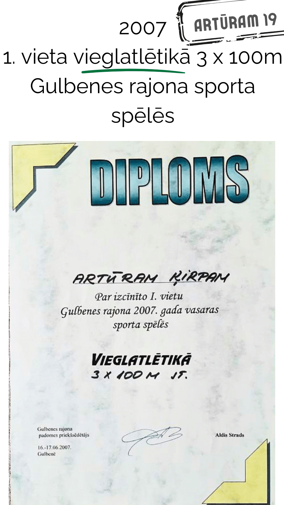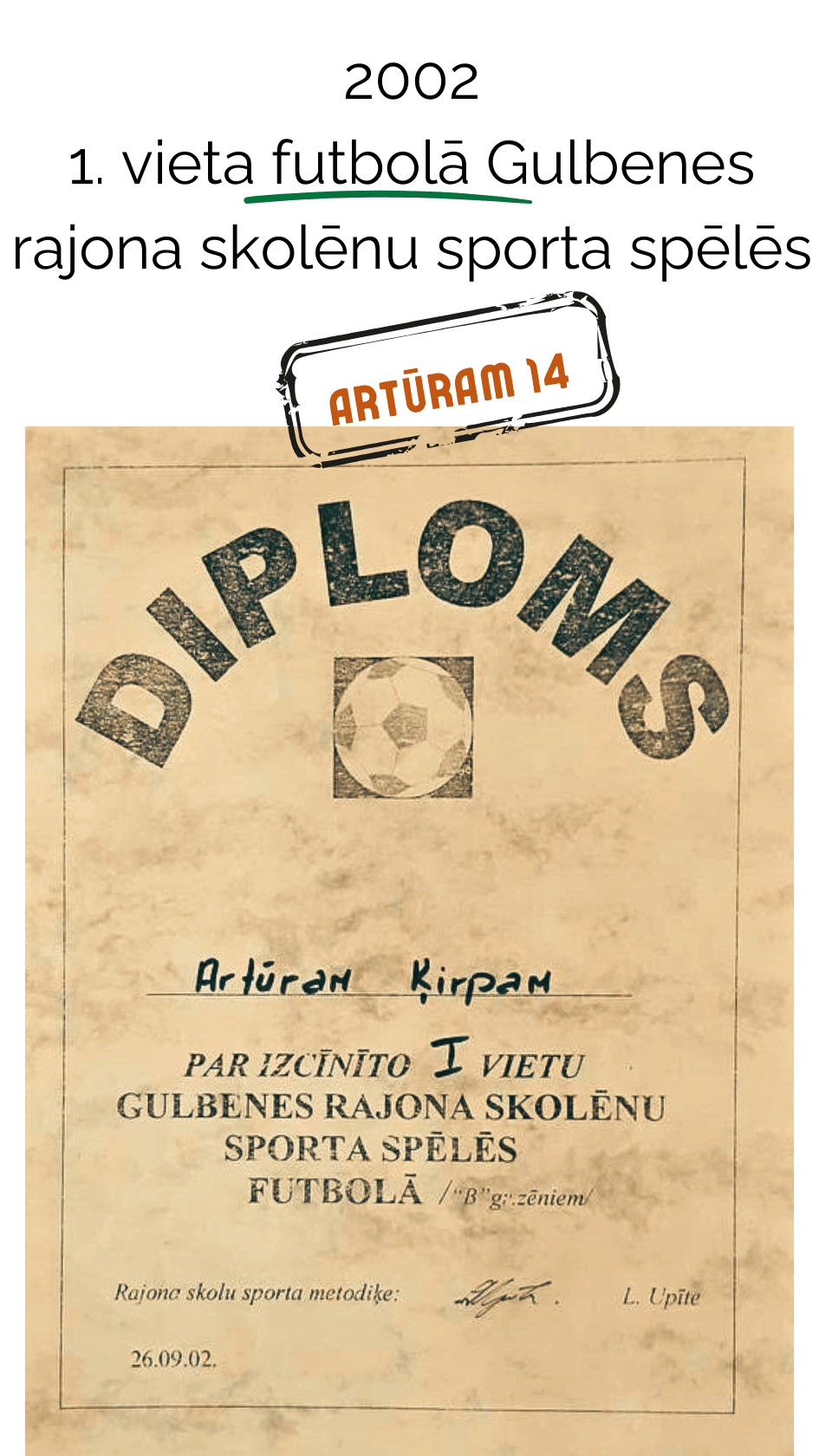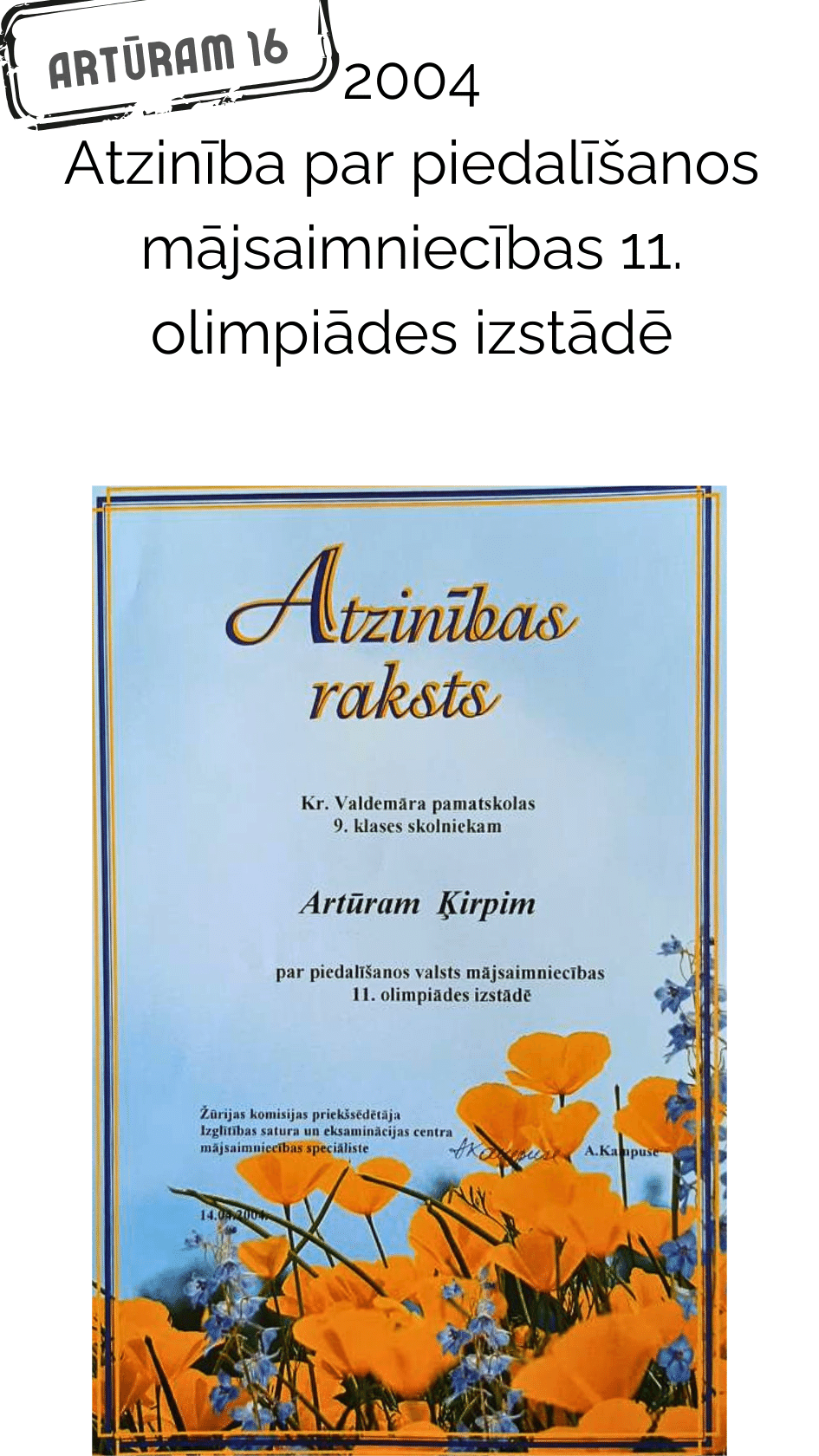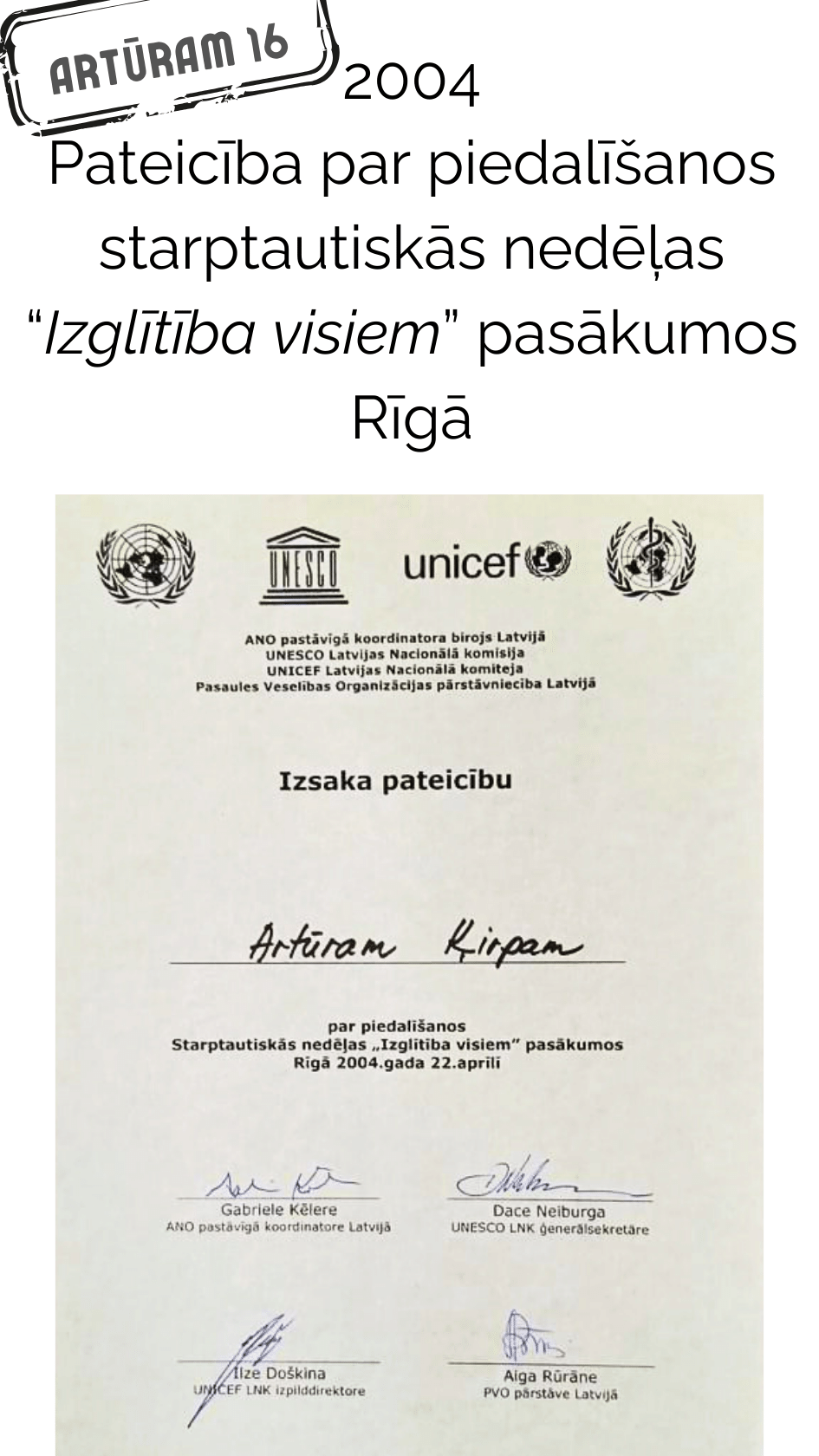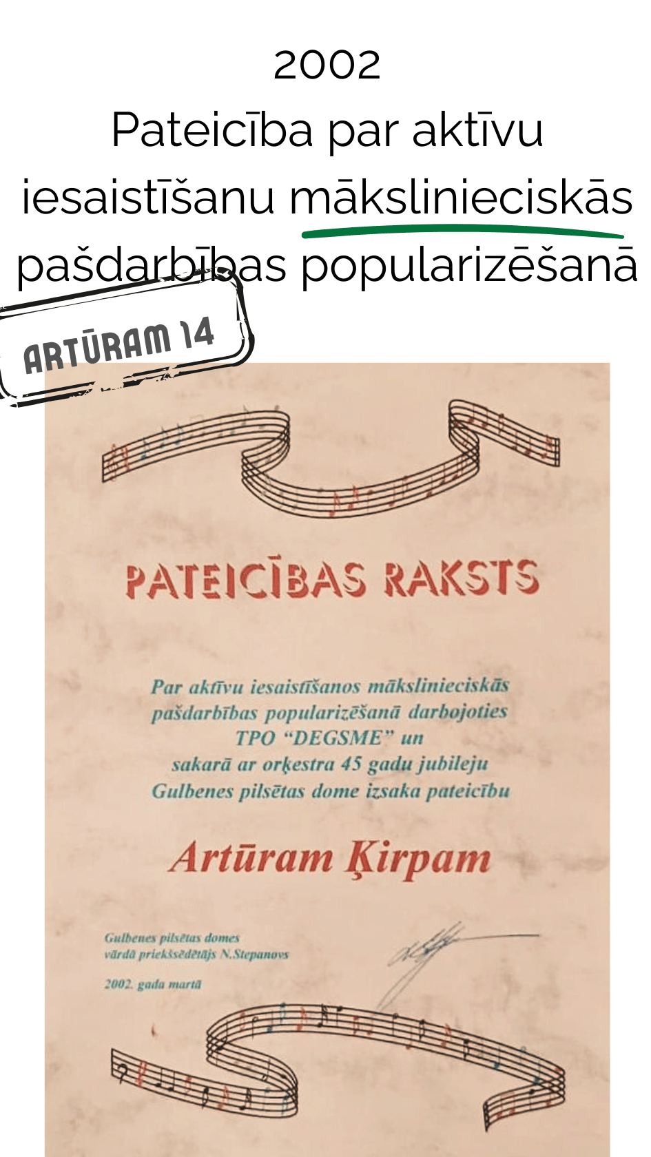 Artūra Ķirpa vecāku rūpīgi glabātie dēla diplomi liecina, ka pirmo diplomu Artūrs saņēmis septiņu gadu vecumā, izgudrojot kādas konfektes nosaukumu. Kopumā vecāku izveidotajā arhīvā ir 90 diplomi, atzinības raksti, sertifikāti, apliecinājumi, apbalvojumi un citas godalgas, kas gluži kā starmeši izgaismo Artūra dzīves pagriezienus, nebeidzamo radītkāri un urdošo vēlmi paplašināties. Nu Artūra diplomu arhīvs ieguvis digitālu veidolu. Šķita negodīgi šīs pērles turēt bēniņos.